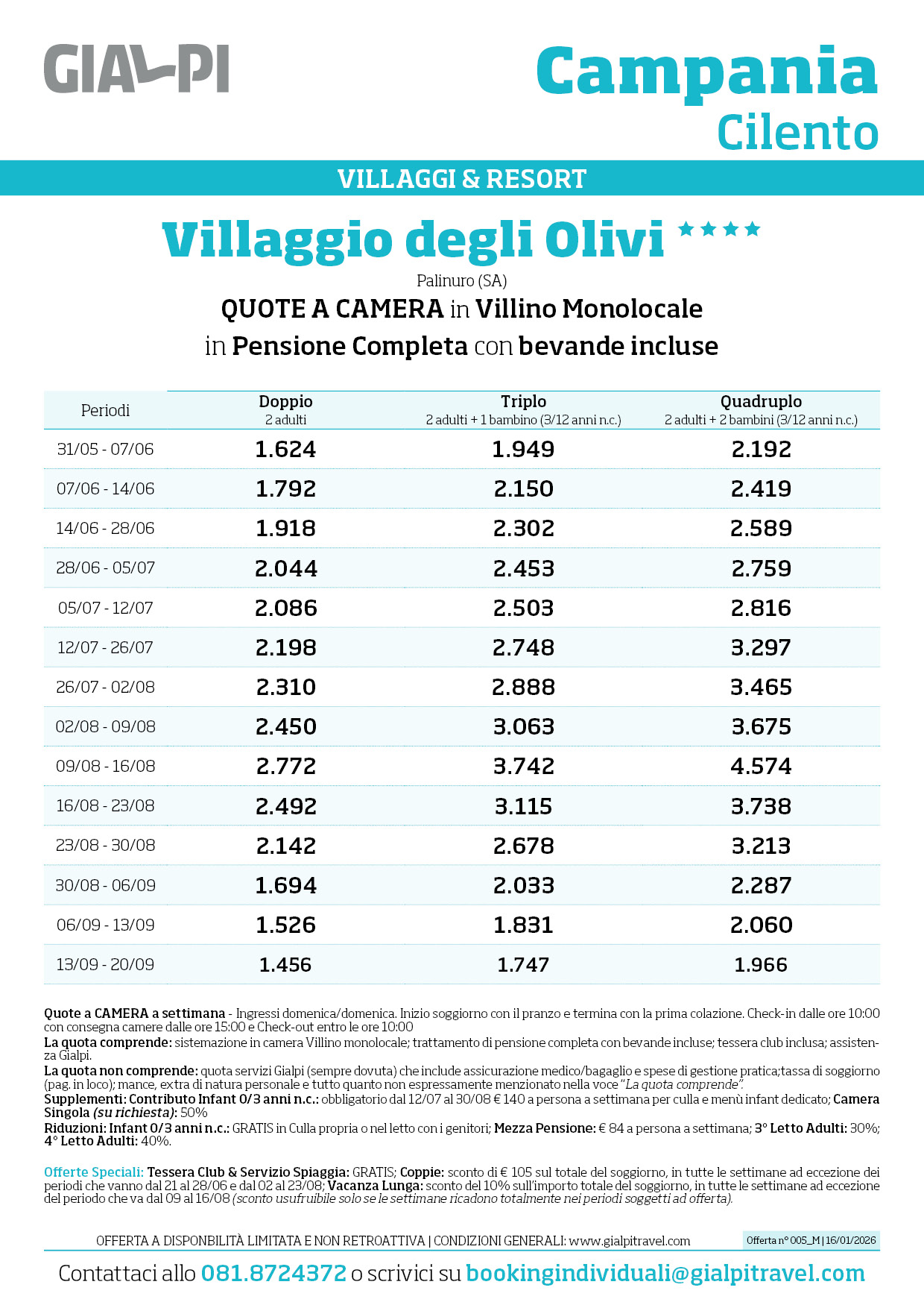 IMPORTANTE: a seguito del DECRETO-LEGGE – 16 Maggio 2020, n. 33, che prevede che le attività economiche, produttive e sociali devono svolgersi nel rispetto dei contenuti di protocolli o linee guida idonei a prevenire o ridurre il rischio di contagio da COVID-19, si precisa che i servizi e le attività descritti nella presente scheda potranno subire modifiche e/o limitazioni durante la stagione estiva 2021. Tali eventuali variazioni potranno rendersi necessarie a causa dell’esigenza da parte delle strutture ricettive di adeguarsi ai protocolli COVID-19, attuali e a quelli che potranno essere prescritti dalla legge nazionale, regionale e/o locale durante il corso della stagione.